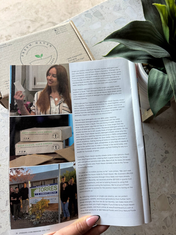 We are thrilled to have found a non toxic, sustainable, and effective laundry product. We gladly said goodbye to huge plastic bottles, gunky liquid soap, and "fragrances" we didn't like to welcome these simple laundry sheets into our home. Thank you FreshHaven!